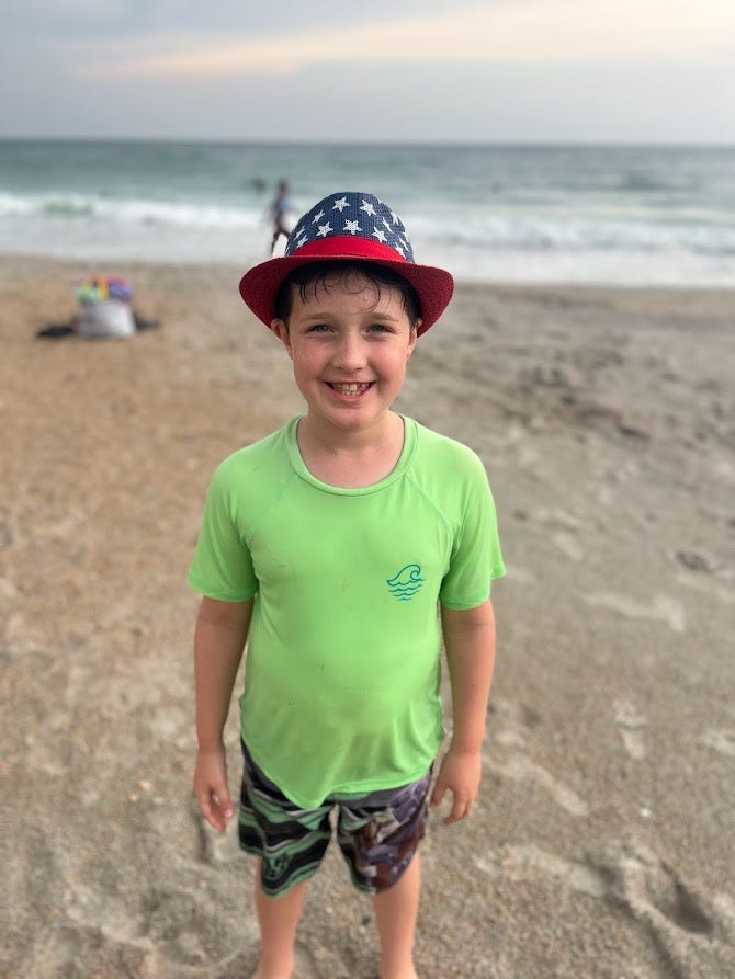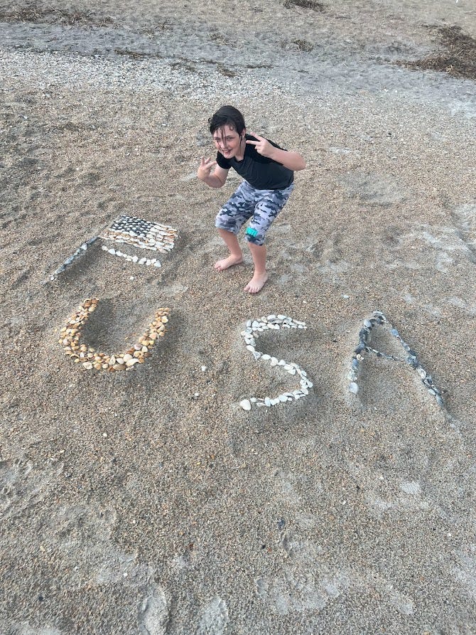 Anyway, life is for the living or whatever, so we lived it up on the Fourth: one of my kids had the time of his life wearing the patriotic hat and we also found some cool beach art and pretended that we made it.
