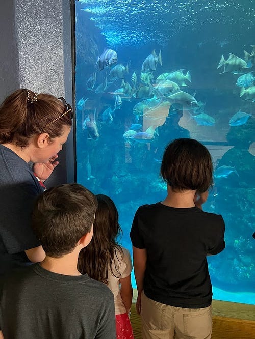 As we entered, my 7-year-old daughter immediately complained that the place smelled like fish. Both gross and unexpected. We held our noses and wandered over to one of our first stops: a tank that was set low to the ground and didn’t have a top so anyone could reach in and strangle some squids. An older gentleman who seemed to be patrolling the aquarium in some official capacity, tasering any would-be squid stranglers, pointed at my son’s UCF shirt and asked him where the Knights were from. My son cut his eyes in my direction in a manner that clearly indicated “HELP!” so I jumped in and said, “Orlando.” The man then said, “Oh, well then, you should know exactly what to do.” I don’t know why, but this made me feel uncomfortable in a vague sort of way. Kind of like when you stand up after sitting for too long with your leg tucked up under you and your foot just feels a little off. I quickly plunged my hand into the tank and petted the coral with two fingers, as directed, to diffuse any mounting tension.